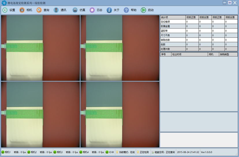 安装在卷绕机上,采用四个相机,分别检测阳极正反面,阴极正反面的绿胶粘贴不良的缺陷。